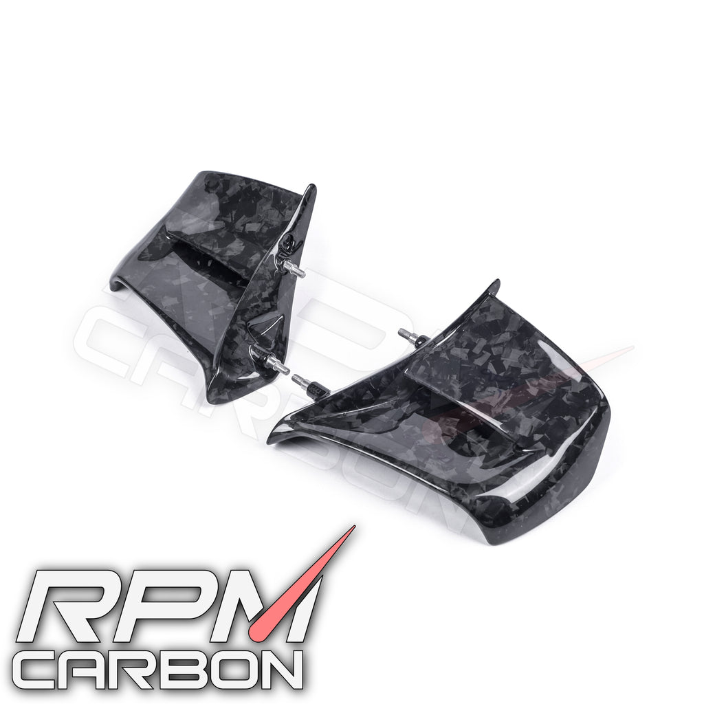 Transform the front profile of your Ducati Panigale V4 with RPM Carbon's sleek and aggressive carbon fiber winglets.  These striking winglets are a highlight of the bike's design, dramatically enhancing its appearance and creating a more track-focused aesthetic.  A must-have for riders looking to make a statement.
